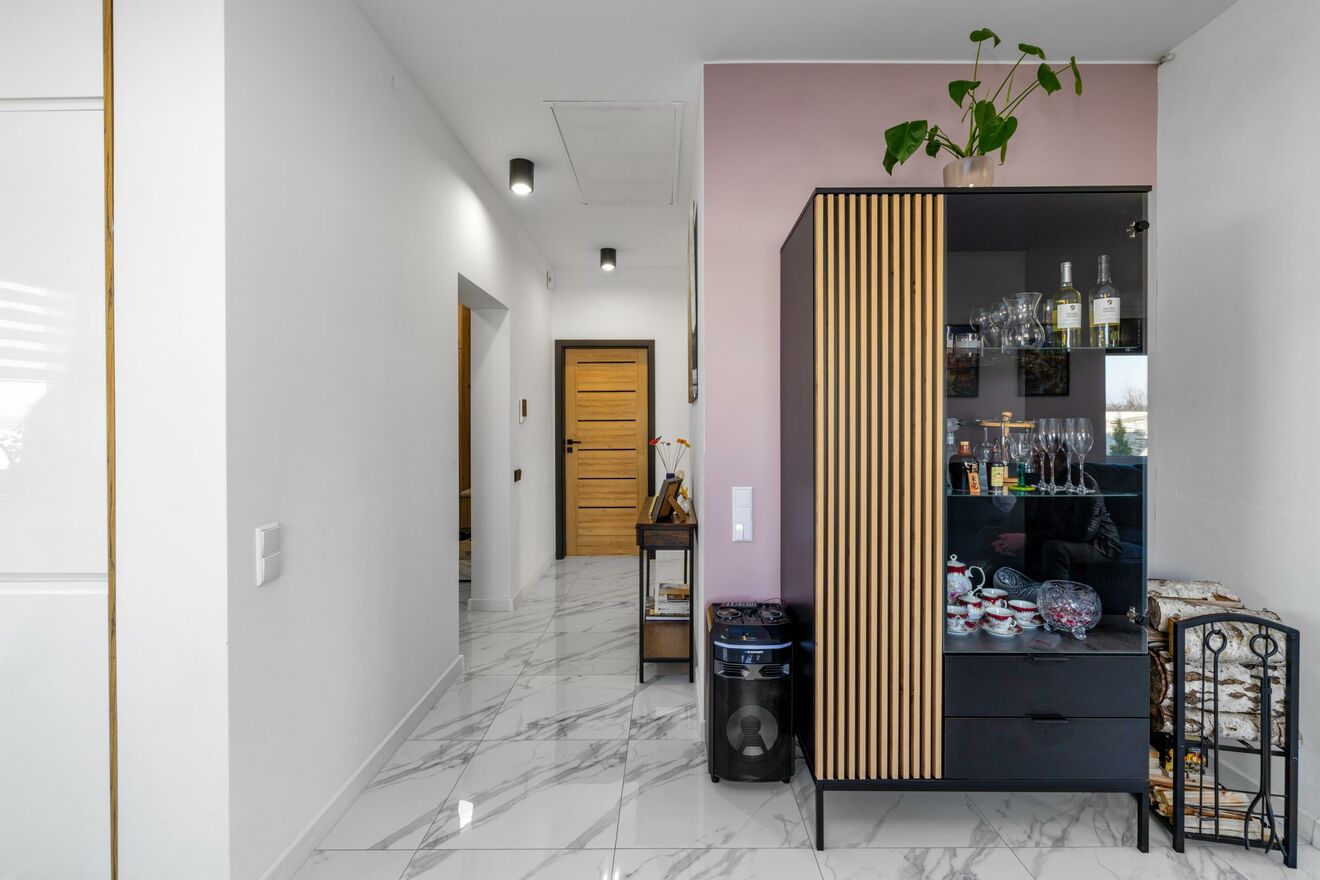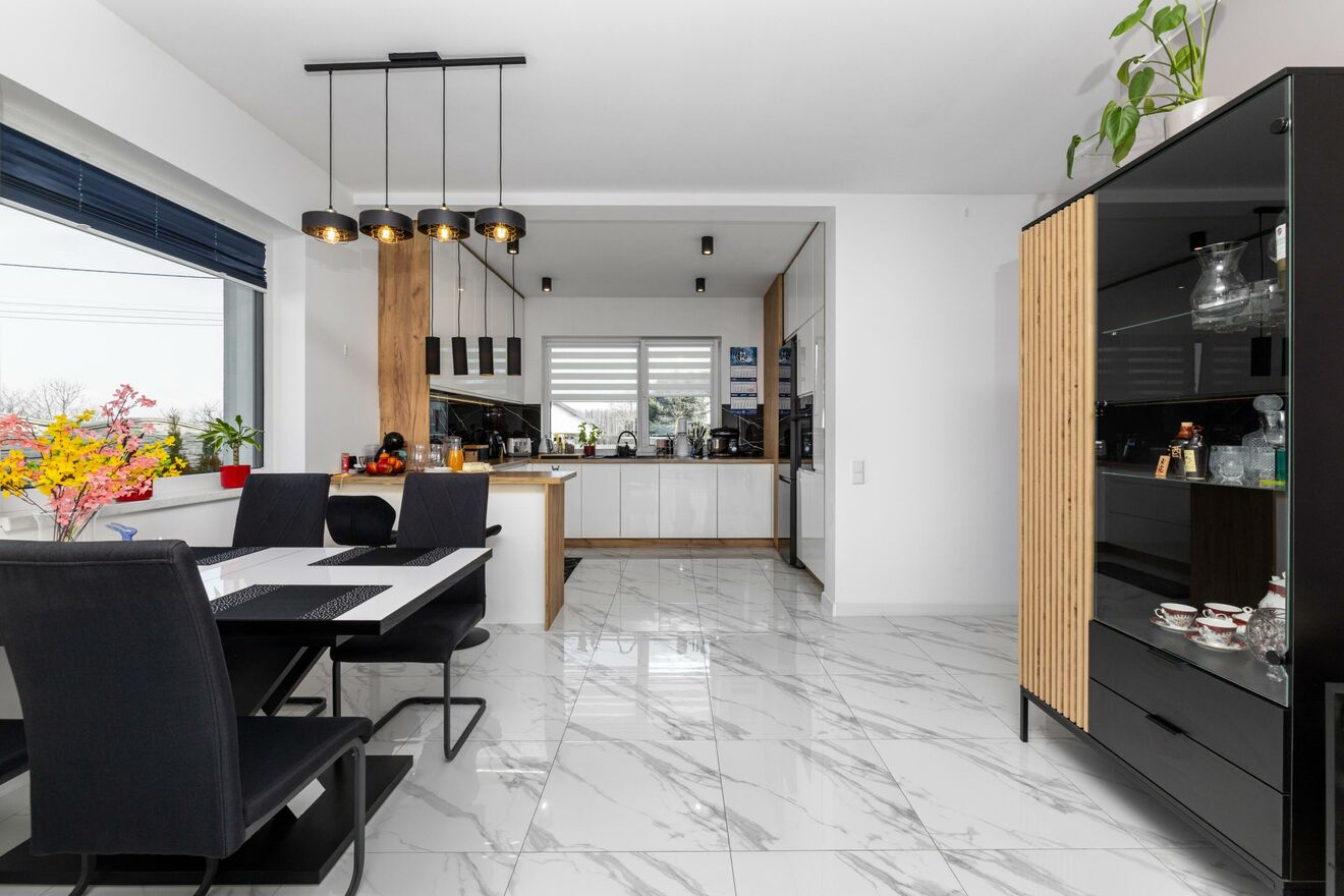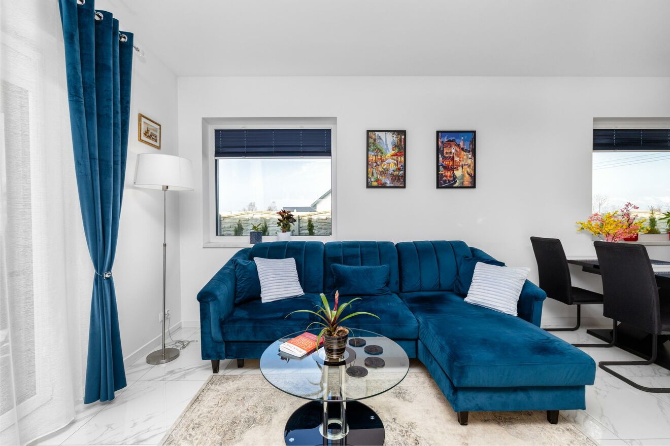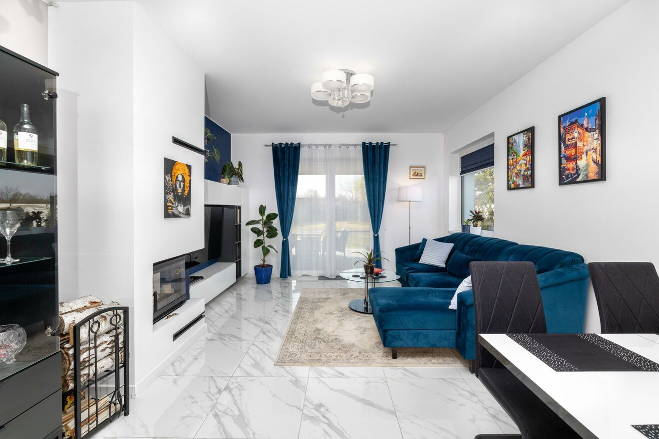 - Przestronny salon z aneksem kuchennym i kominkiem - idealne miejsce do spotkań rodzinnych i relaksu.