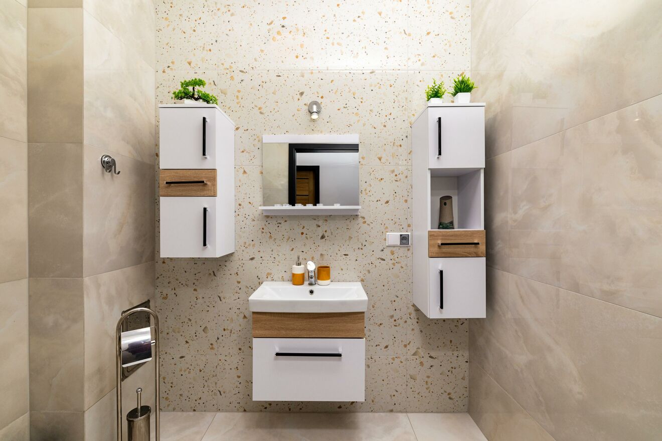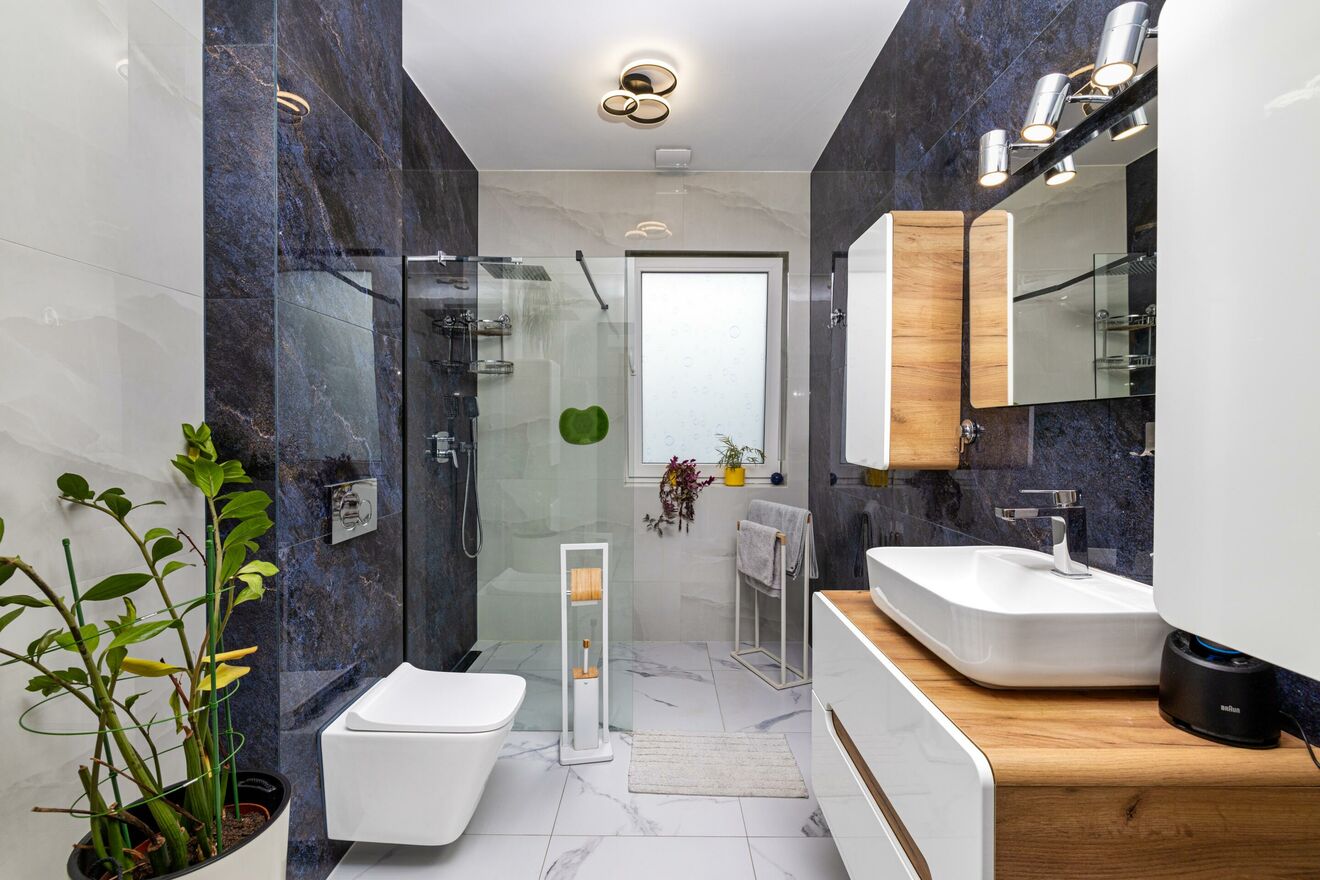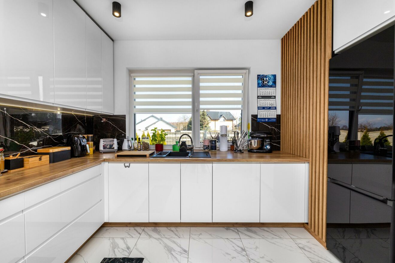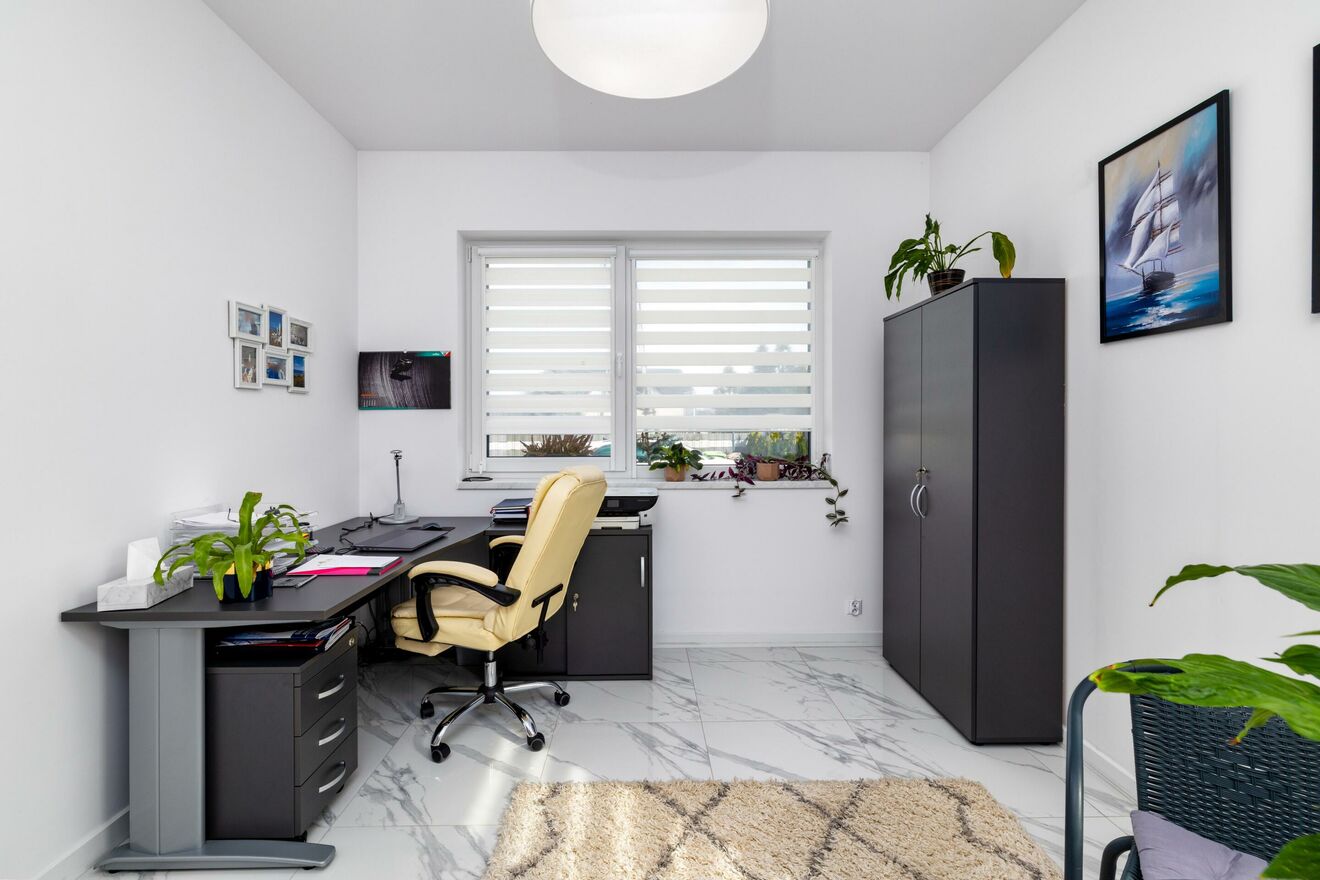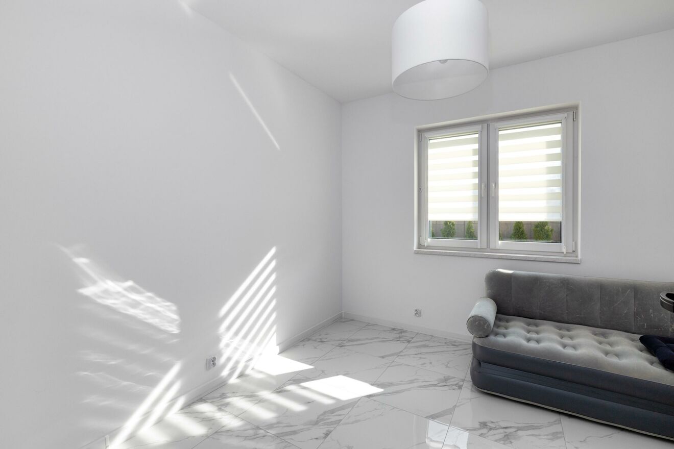 Podłogi wykończone gresem wysokiej jakości. Rolety dzień/noc w całym domu.