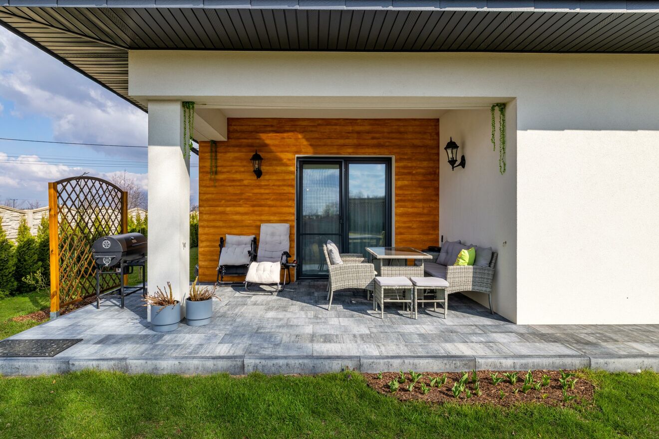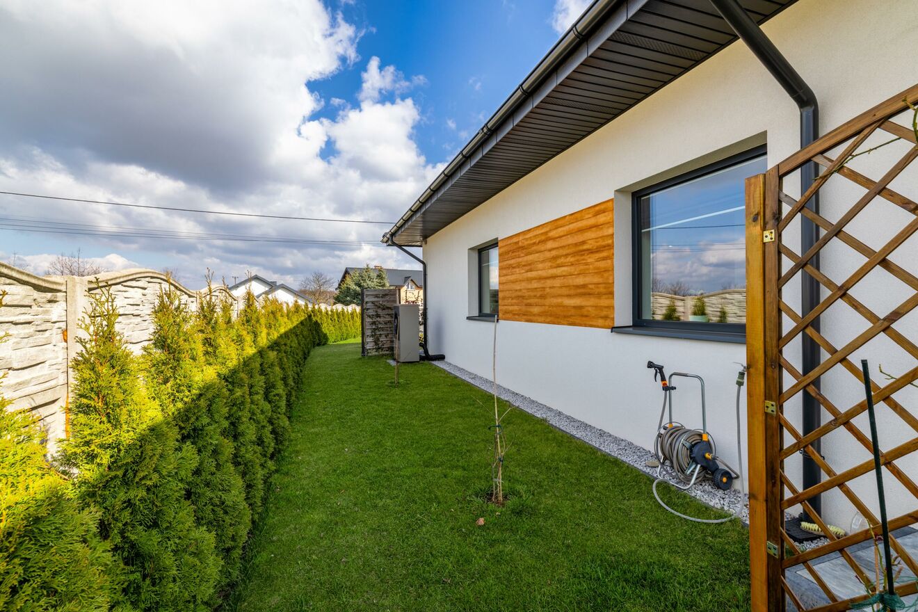Dom wybudowany z wysokiej jakości materiałów, dach pokryty trwałą dachówką Roben, okna trzyszybowe, solidna izolacja 20 cm.